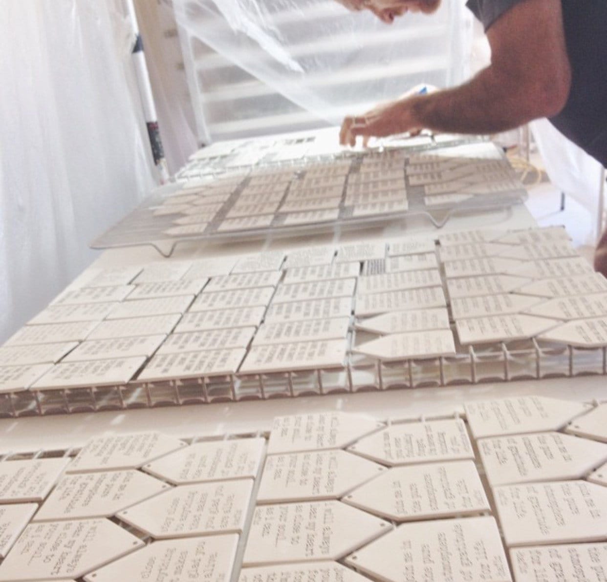 screen printed text (we do not use decals), covered with a coat of clear glaze and fired to 2,200 degrees.